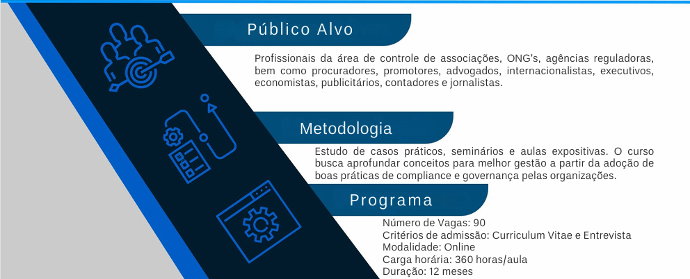 O curso pretende ampliar o conhecimento de profissionais acerca dos programas de Compliance, também conhecidos como de conformidade, de cumprimento e de integridade. São cada vez mais relevantes a prevenção de riscos nas instituições pelo descumprimento de obrigações legais ou regulatórias e o estabelecimento de padrões de condutas a fim de evitar ilícitos. O conteúdo está distribuído em três Eixos: abordagem inicial sobre Compliance, interface entre Compliance e legalidade no âmbito Jurídico e aplicação do Compliance no fortalecimento de Governança. A Governança é um tema multifacetado, principalmente pela natureza e pela extensão da responsabilidade de cada indivíduo na organização. Neste contexto, ela corresponde aos processos, costumes, políticas, leis e instrumentos que são usados para melhorar a administração de uma organização. Tem por objetivo garantir e/ou recuperar a confiabilidade de uma instituição, criando um conjunto eficiente de mecanismos de incentivos e de monitoramento para assegurar que o comportamento dos seus membros esteja sempre alinhado com os interesses da sociedade. Com a Lei das Estatais e o Código da Micro e Pequena Empresa, esses instrumentos de garantia e confiabilidade tendem a ser adotados em maior escala pelas instituições, de maneira geral. O curso será pautado pela efetiva interação dos alunos das esferas públicas e privadas e pelos desafios que enfrentam, que acabam apresentando elementos em comum. Haverá a exposição de estudos de caso, com representantes de corporações públicas e privadas, de forma a complementar a formação teórica pretendida pelo curso com exemplos cotidianos. Portanto, os participantes, após a conclusão do curso, terão plenas condições e conhecimentos específicos que os habilitarão a usar ou criar procedimentos para alinhar interesses dos governos, das empresas e principalmente da sociedade. Com este desafio, a Universidade de Brasília foi buscar no governo e no mercado profissionais de destaque para oferecer a comunidade um curso que seja referência nacional nestes temas.