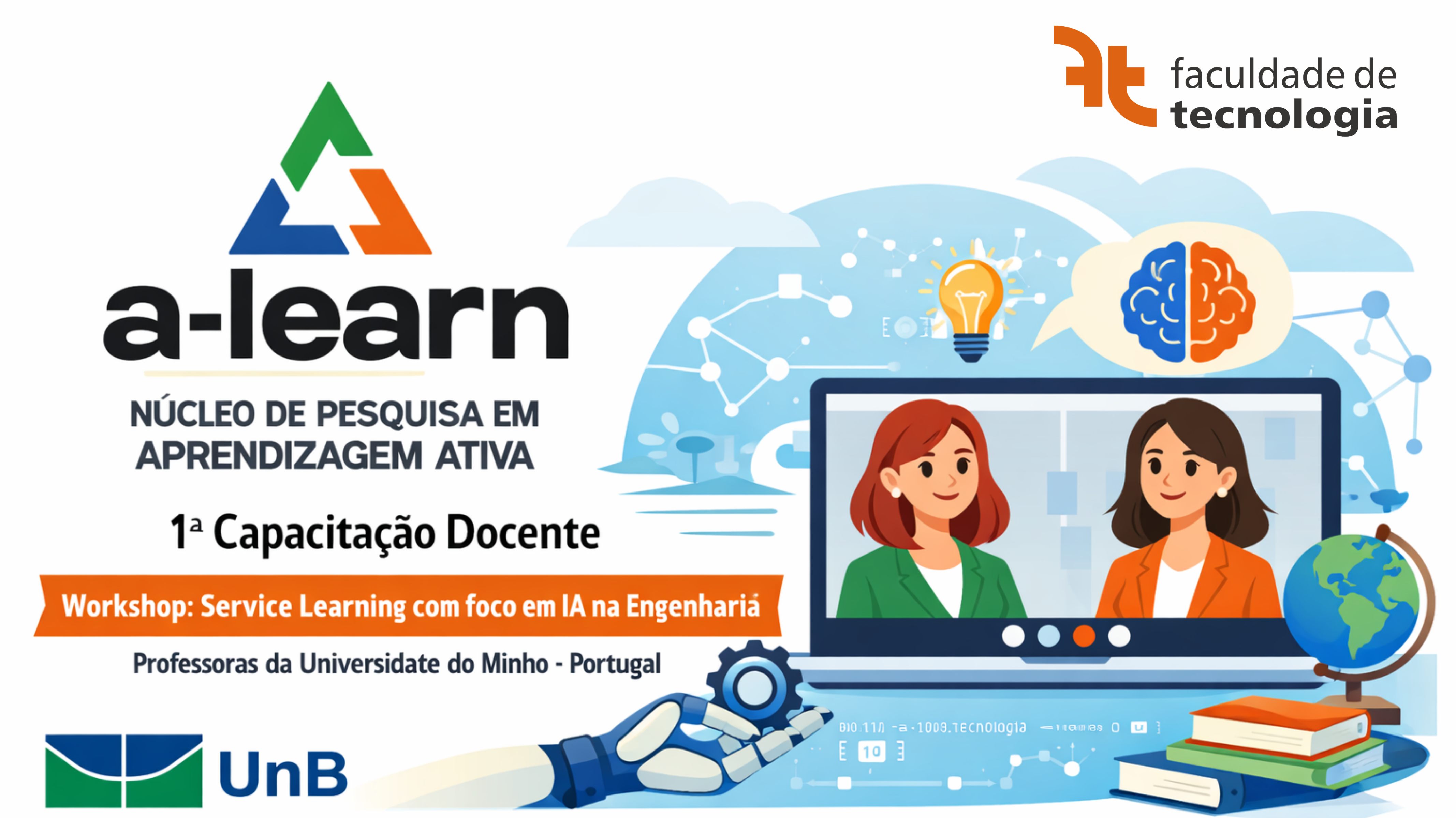 No dia 12 de março de 2026, ocorreu a primeira capacitação docente promovida pelo A-LEARN, com o workshop "Service Learning com foco em IA na Engenharia”, realizado em formato remoto. O evento contou com a participação de docentes interessados em novas abordagens pedagógicas para o ensino de engenharia.
